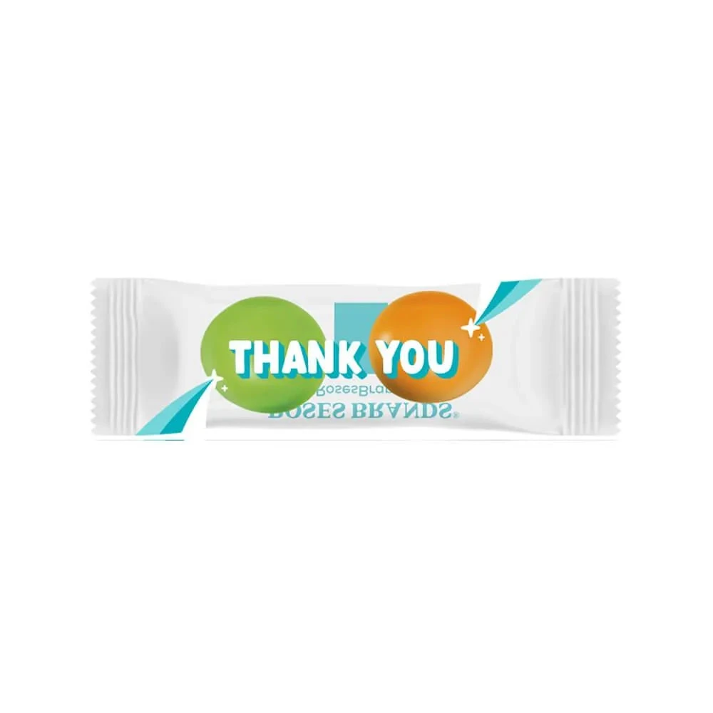 Case includes 1,000 Assorted Colors Thank You Chocolate Mint Candy Packs, each containing 2 mints.